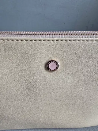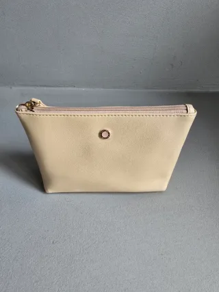 Pochette Bulgari in tonalità beige con dettagli oro. Un accessorio elegante e pratico. Ancora sigillato contiene un mini profumo, creme e altri accessori - Materiale: similpelle - Chiusura con zip - Logo frontale rotondo