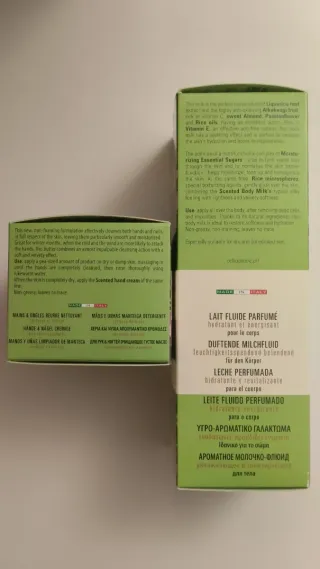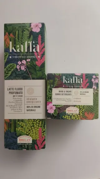 Set di prodotti Kaffa, ideale per il corpo e le mani. - Latte Fluido Profumato per il corpo con Alchechengi e Liquirizia. - Mani & Unghie Burro Detergente. - Entrambi con ingredienti di origine naturale. - Confezione regalo inclusa. Mai aperto, confezioni integre.