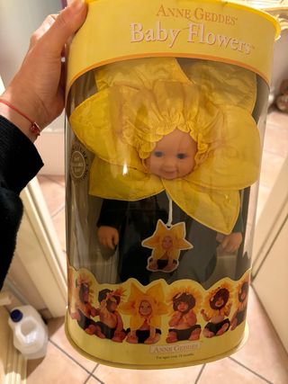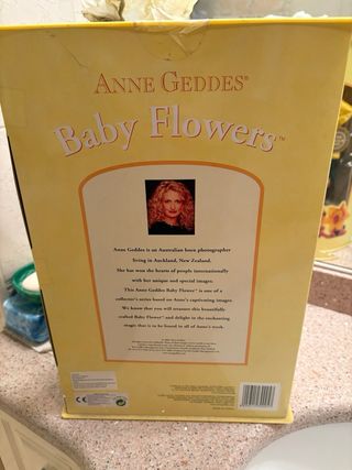 Bambola da collezione Anne Geddes della linea Baby Flowers. - Raffigura un neonato vestito da fiore. - La confezione include un cartellino a forma di fiore con l'immagine del neonato. - Adatta per collezionisti e amanti del genere.