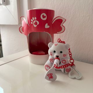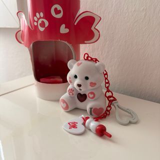 Grazioso orsetto portachiavi a tema amore. Perfetto per decorare borse o zaini. - Orsetto bianco con dettagli rosa. - Biberon rosso. - Ciondolo a forma di cuore con scritta Love. - Ciondolo a forma di cuore vuoto.