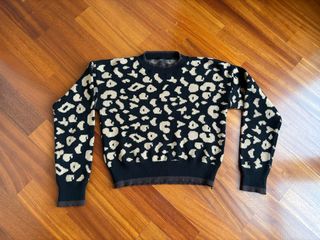 Maglione corto con fantasia maculata. - Fantasia maculata su base nera. - Bordi a costine. - Maniche lunghe. misure: spalle 47 cm larghezza 42 cm lunghezza 43 cm maniche 45 cm