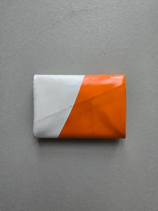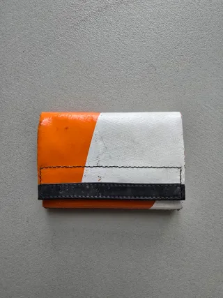 Portafoglio Freitag con un design unico. - Combinazione di colori arancione e bianco. - Materiale resistente e durevole.