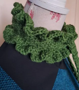 Sciarpina lavorata all'uncinetto con un delizioso effetto fru fru o rouches sul bordo. Perfetta per aggiungere un tocco di colore e originalità al tuo outfit. - Lavorazione artigianale all'uncinetto. - Design con rouches decorativi.