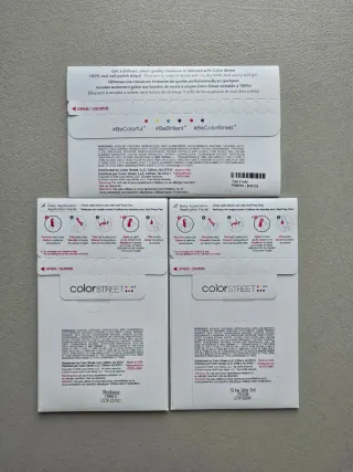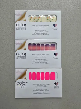 Set di 3 confezioni di strisce per unghie Color Street. - 16 strisce per confezione. - Design floreale e fruttato (confezione superiore). - Design sfumato rosa/viola (confezione centrale). - Design rosa acceso (confezione inferiore).