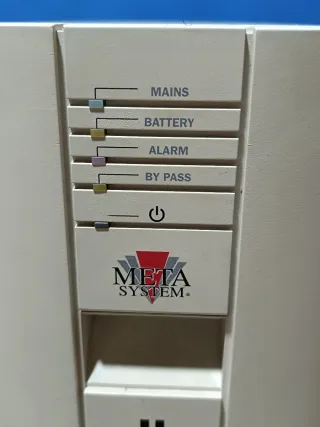 Gruppo di continuità Meta System Ally HF 1000 - Indicatore MAINS - Indicatore BATTERY - Indicatore ALARM - Indicatore BY PASS - Pulsante di accensione/spegnimento - Logo Meta System - Modello Ally HF - UPS MetaSystem 👁️ Attenzione il gruppo di continuità è funzionante ma dato il tempo che e rimasto fermo ci sono le batterie interne da sostituire 👁️ - Misure dell'articolo : - Lunghezza 40 cm. - Larghezza 16 cm. - Altezza 35 cm. - Peso 10 kg.