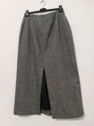 Elegante gonna lunga in misto lana e seta. - Tessuto grigio mélange. - Lunghezza midi/maxi. - Vestibilità comoda. Ottime condizioni. No poste italiane. Misure sotto per verifica prima di acquistare. Vita non elastica. Etichetta con taglie per nazioni e tessuto in foto. Misure lineari : Vita 35 cm Lunghezza 82 cm