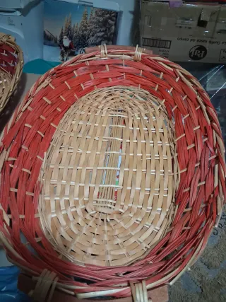Set di cesti in vimini con dettagli rossi, perfetti per decorare o contenere. - Realizzati in vimini intrecciato. - Bordi decorati con nastri rossi.