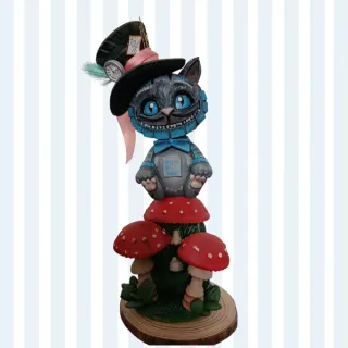 Statua artigianale dello Stregatto, personaggio iconico di Alice nel Paese delle Meraviglie. Perfetta per gli amanti del fantasy. - Dettagli curati e colorati. - Realizzata a mano. - Base a forma di fungo.