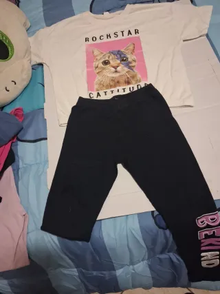 Set coordinato per bambina composto da maglietta e leggings. - Maglietta bianca con stampa Rockstar Cattitude e gatto. - Leggings neri con scritta Be Kind su una gamba.