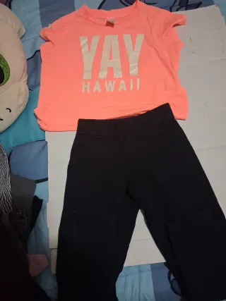 Set coordinato per bambina composto da maglietta e pantaloni. - Maglietta arancione con stampa YAY HAWAII. - Pantaloni neri. - Taglia 7 anni.