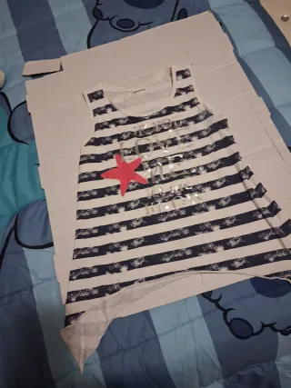 Canotta a righe blu e bianche per bambina, taglia 12 anni. Presenta una stampa con stellina rossa. - Fantasia a righe. - Dettaglio stellina rossa. - Stampa con scritte argentate.