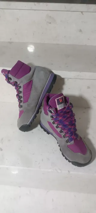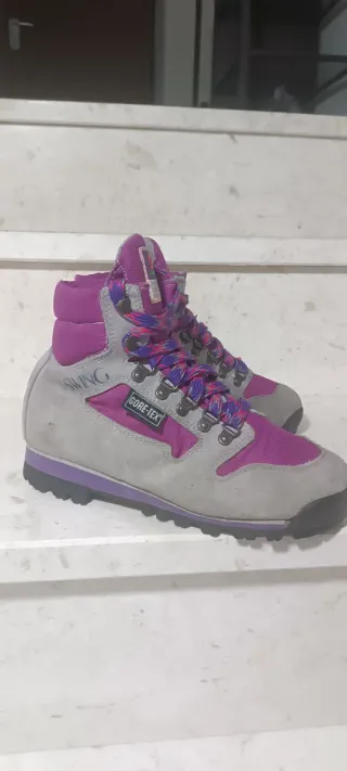 Scarpe da trekking alte da donna, perfette per le escursioni. - Tomaia in camoscio e tessuto. - Fodera interna in Gore-Tex. - Suola in gomma resistente. - Lacci bicolore.