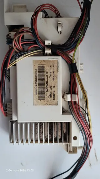 Scheda elettronica per lavatrice Ariston. - Codice: 21501216100 - SN: 1514302232 - Firmware 1: 110100 - Firmware 2: 016808 - Produttore: Flextronics La scheda è stata smontata dal modello di lavatrice che si vede in foto