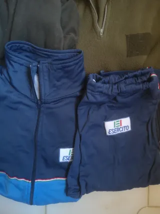 Lotto composto da una tuta sportiva e due maglioni. - Tuta sportiva blu con logo Esercito Italiano. - Due maglioni in pile, uno verde oliva e uno grigio scuro, con patch. - Materiale pile per i maglioni.