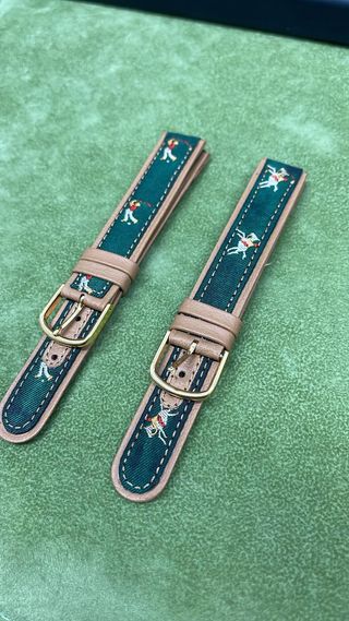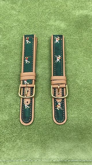 Set di due cinturini per orologio con un design unico. - Motivo a tema golfisti. - Finitura in pelle beige. - Tessuto interno a fantasia verde.