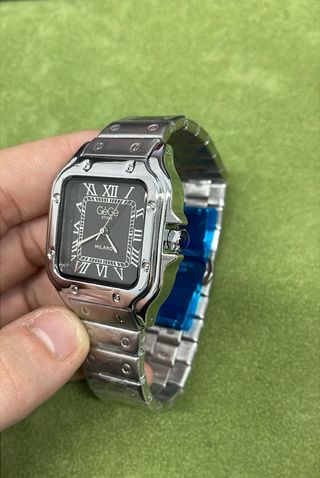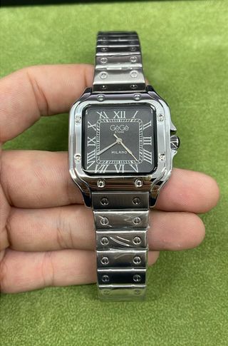 Elegante orologio Gege Store con cassa quadrata e cinturino in metallo. Movimento Miyota - Quadrante grigio con numeri romani. - Logo Gege Store e MILANO sul quadrante. - Design moderno e raffinato.