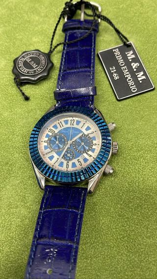 Orologio da polso M&M Primo Emporio con cinturino blu. - Quadrante con cronografo. - Lunetta blu. - Resistente all'acqua 30 MTS.