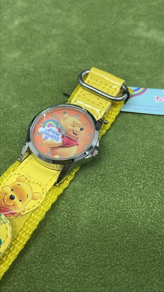 Orologio da polso con il personaggio di Winnie the Pooh. - Quadrante con Winnie the Pooh e arcobaleno. - Cinturino giallo con dettagli a forma di cuore e scritte. - Design ispirato ai personaggi Disney.