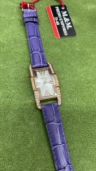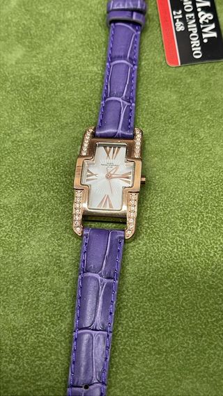 Elegante orologio da polso M&M, un pezzo vintage che aggiunge un tocco di classe. Fondo magazzino spedito con scatola e garanzia - Cinturino in pelle viola con finitura effetto coccodrillo. - Cassa rettangolare impreziosita da cristalli. - Quadrante con numeri romani e dettagli dorati.