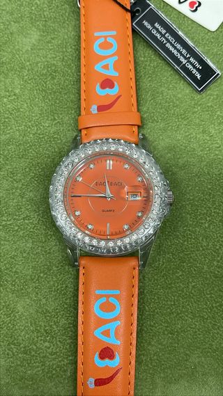 Orologio da polso con cinturino in PVC arancione e quadrante dello stesso colore. La ghiera è impreziosita da cristalli. - Cinturino in PVC arancione con logo. - Quadrante arancione. - Ghiera con cristalli. - Movimento al quarzo.