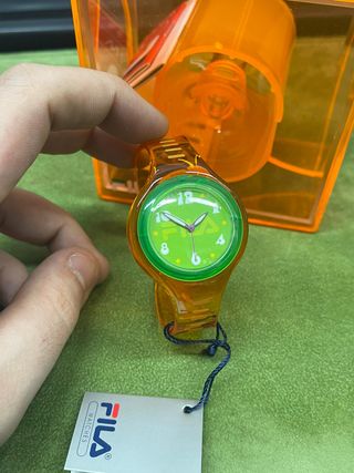 Orologio Fila vintage con cassa e cinturino trasparenti arancioni e quadrante verde. Ancora inscatolato mai utilizzato, orologio per bambini vintage - Design colorato e vivace. - Marchio Fila ben visibile.