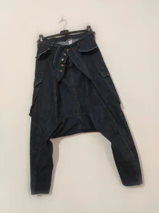 Jeans modello harem da donna. - Vita con chiusura a bottoni e laccetto. - Tasche laterali applicate. - Design ampio e comodo. Ottime condizioni. No poste italiane. Vita non elastica. Misure sotto per verifica prima di acquistare. Etichetta con taglia e tessuto in foto. Misure lineari : Vita 38 cm Lunghezza 92 cm
