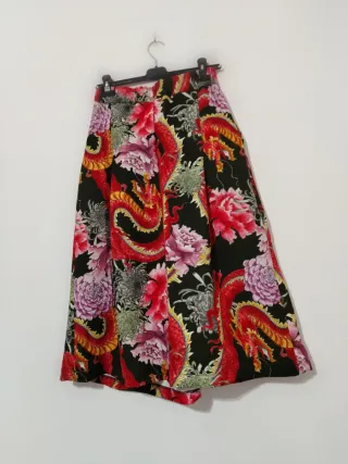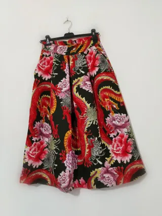 Gonna ampia con una vivace fantasia in stile orientale, caratterizzata da draghi rossi e fiori colorati su sfondo nero. - Design con draghi e fiori. - Stile orientale. - Ampia vestibilità. Ottime condizioni. No poste italiane. Misure sotto per verifica prima di acquistare. Vita leggermente elastica. Etichetta con tessuto non disponibile. Tasche laterali. Tonalità di colori visibile bene nell'ultima foto. Misure lineari : Vita 34 cm Fianchi 40 cm Lunghezza 78 cm
