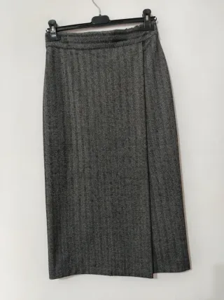 Gonna grigia con fantasia a spina di pesce. - Modello wrap. - Tessuto con trama a spina di pesce. Ottime condizioni. No poste italiane. Vita elastica. Misure sotto per verifica prima di acquistare. Etichetta con taglia e tessuto in foto. Misure lineari : Vita 34 cm Massima estensione vita 45 cm Lunghezza 75 cm