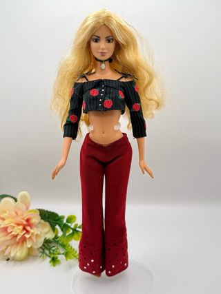 Barbie ispirata a Shakira, edizione del 2003. - Capelli biondi lunghi e mossi. - Indossa un top corto a righe nere con rose rosse e pantaloni rossi a zampa. - Accessoriata con una collana girocollo. Macchia ombellico Outfit adattato
