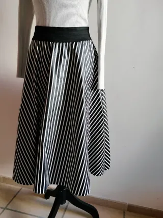 Gonna a ruota con elastico in vita fantasia a righe bianca e nera, ecopelle, tg unica (maglietta bianca compresa) #gonnaruota #gonnaecopelle #gonnarighe #gonnabiamcaenera #gonnamidi