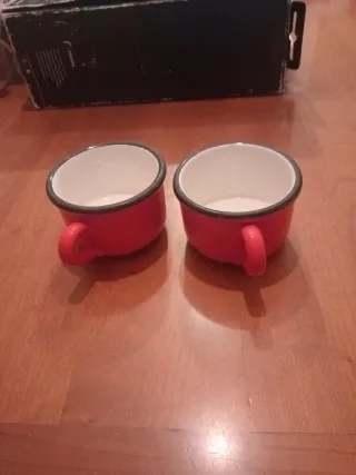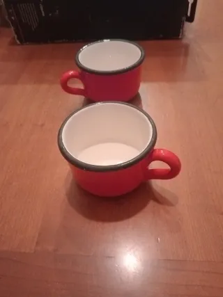 Set di due tazze rosse, perfette per tè o cioccolata calda. Hanno un design classico e sono adatte per un uso quotidiano. - Set da 2 tazze. - Finitura esterna rossa e interna bianca. - Bordo nero