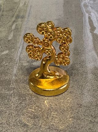 Statuetta decorativa a forma di albero dei soldi in stile Feng Shui. Realizzata in metallo dorato, è un simbolo di prosperità e buona fortuna. - Design a forma di albero con monete. - Base rotonda. - Finitura lucida dorata.