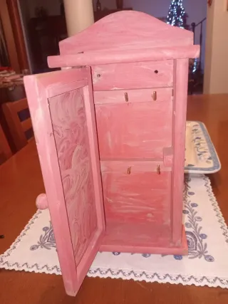 Delizioso armadietto in legno, perfetto per organizzare le chiavi. In ottime condizioni - Tonalità di colore rosa antico - Perfetto per una casa arredata in stile country - Si può usare anche come armadio per u vestiti delle bambole