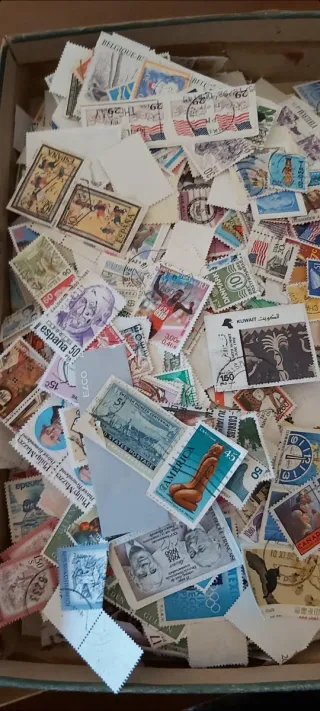 Lotto di francobolli provenienti da diverse nazioni. Vendo come visibile in foto, una scatola da scarpe ricolma di francobolli esteri ( provenienti da corrispondenza aziendale ) non catalogati. Provenienza: da tutto il mondo. Non presenti francobolli Italia in quanto li avevo filtrati a suo tempo. Ho ricevuto la scatola un 10-15 anni fa. Indicativamente annate 1960:1990. Peso netto 630 grammi.