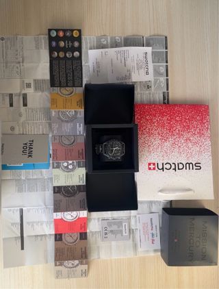Orologio Swatch x Omega Mission to Mercury. - Cassa in bioceramica nera. - Cinturino in velcro nero. - Quadrante nero con indici e lancette argentati. - Movimento al quarzo. - Resistente all'acqua fino a 3 bar. - Include scatola originale e documentazione.