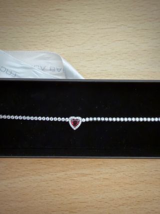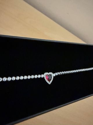 Elegante bracciale in argento con zirconi scintillanti e un pendente a forma di cuore rosso. - Design a tennis con pietre luminose. - Cuore centrale rosso. - Chiusura sicura.