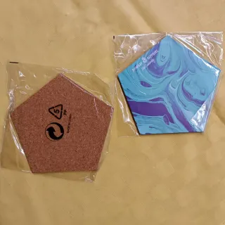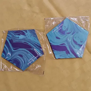 Set di due sottobicchieri a forma esagonale con un design astratto nei toni del blu e del viola. - Design unico e colorato. - Materiale resistente.