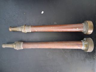 Coppia di lance per idrante in stile vintage, realizzate con una combinazione di ottone e rame. - Materiali: ottone e rame. PERIODO: '900 LANCIA per manichetta pompieri CONDIZIONI: Buone, oggetto vecchio con la sua patina, presenta normali segni del tempo,osservare attraverso le foto allegate in inserzione!!