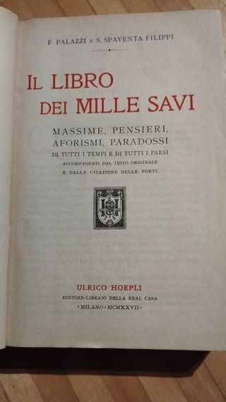 Il libro dei mille savi Massime pensieri aforismi paradossi di tutti i tempi e di tutti i paesi. Accompagnati dal testo originale e dalla citazione delle fonti. Il volume si presenta in buono stato di conservazione. Il dorso e le copertine mostrano lievi segni di usura. Le pagine interne sono ingiallite dal tempo e fruibili. I tagli bruniti e regolari. La cerniera è salda. Numero pagine 927. Autore: F. Palazzi, S. Spaventa Filippi Editore: Ulrico Hoepli Collana: Lingua: INTERLINGUE Luogo edizione: FIRENZE Argomento: CULTURA Anno: 1927 Stato: USATO Volume: Rilegatura: RILEGATO