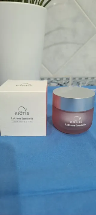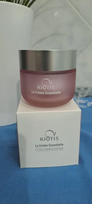 Crema viso Kiotis La Crème Essentielle, con un delicato profumo di rosa. - Vasetto in vetro color rosa. - Tappo color argento. - Scatola originale inclusa.