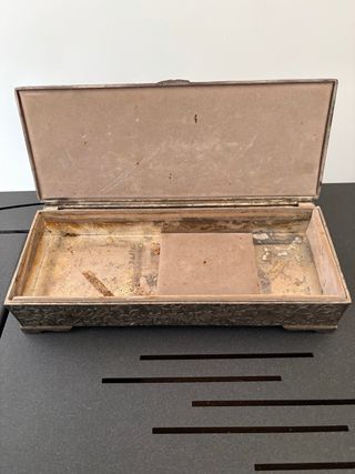 Elegante portagioie vintage con una raffinata decorazione floreale che ne esalta il design. - Finitura in argento. - Motivo floreale inciso su tutta la superficie. - Piedini decorativi alla base.