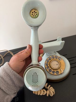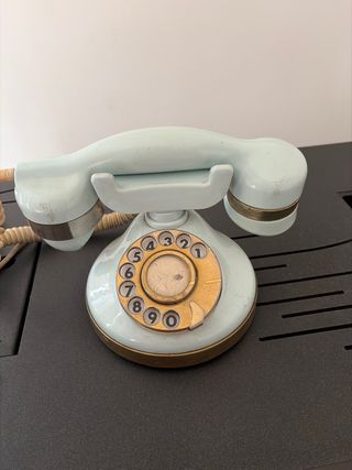 Un classico telefono da tavolo Telcer, un pezzo di design che aggiunge un tocco retrò alla tua casa. La sua finitura bicolore lo rende un oggetto d'arredo unico. - Design iconico. - Colore azzurro con dettagli oro.