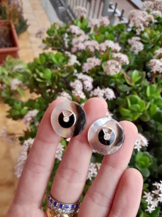 Eleganti orecchini vintage con clip, realizzati in madreperla e con finiture placcate oro. - Design rotondo con dettagli in madreperla. - Elementi centrali neri e luminosi in resina e zirconi - Chiusura a clip, adatti a chi non ha fori. - Stile unico e raffinato.