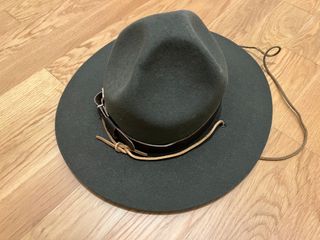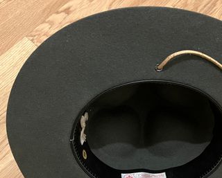 Cappello cappellone Scout a falde larghe Agesci, taglia 56, in lana idrorepellente, dettagli in cuoio, usato in ottime condizioni. Nome di proprietà su etichetta.