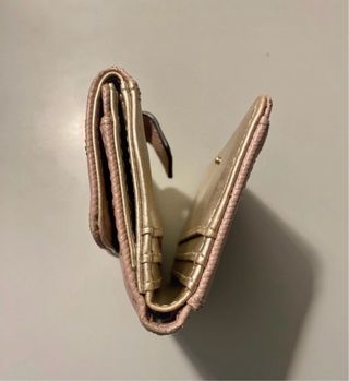 Portafoglio Guess da donna, un accessorio elegante e pratico. - Design bicolore rosa e oro. - Materiale con texture a grana. - Chiusura a bottone.