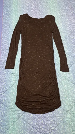 Vestito midi in maglia H&M con un elegante scollo asimmetrico. Il tessuto presenta un motivo a righe sottili bianche. Taglia M. - Vestito midi - Scollo asimmetrico - Maniche lunghe - Spalle imbottite - Tessuto a maglia con fili bianchi