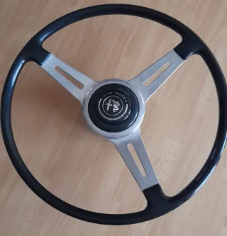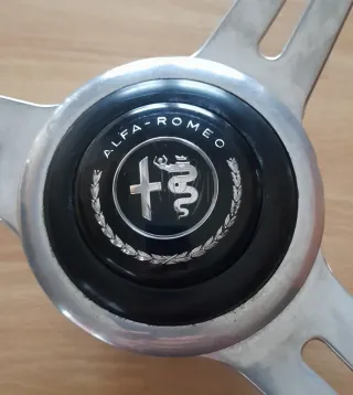 Volante originale Alfa Romeo d'epoca, ideale per modelli serie 105/115 come Giulia GT, junior, Spider (duetto), o berlina. Un pezzo di storia dell'automobilismo italiano, caratterizzato dal classico design a 3 razze in alluminio e impugnatura in bachelite nera. Pulsante clacson originale e completo, con logo classico (Biscione e corona) in buone condizioni ha qualche graffietto. Razze in alluminio con asole longitudinali con normali segni del tempo, attacco mozzo posteriore con attacco a perno conico. Presenta una crepa sulla bachelite in corrispondenza di una razza.