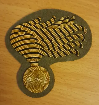 4 fregi dell'arma dei Carabinieri, modello a fiamma caratterizzati da una pregiata fattura artigianale d'epoca. Ricamo a mano in canutiglia oro (filo metallico a spirale) con anima a rilievo. Si distingue nettamente dalle versioni moderne per la compattezza del punto e la lucentezza del metallo. Un pezzo su panno nero, destinato alla Grande Uniforme Speciale o Uniforme ordinaria. Tre pezzi su panno beige variante storica per uniformi da campagna o cappotti d'epoca (periodo anni 70). Fiamma con base a disco (globetto) ricamata a cerchi concentrici. Misure larghezza 7,5 cm altezza 7,5 cm/4,5 cm. Sono in eccellenti condizioni.