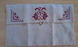 Buste in tessuto vintage perfette per organizzare il corredo, tovaglioli o come raffinati elementi decorativi, lavorazione artigianale. Busta in lino rustico con punto croce: lino a trama naturale con ricamo a punto croce bordeaux, interno con taschina chiusura velcro, chiusura con bottone gioiello dorato. Dimensioni 31 cm x 19 cm Bustina in cotone bianco e pizzo: raffinato richiamo bianco su bianco e bordo in pizzo all'uncinetto fatto a mano, chiusura con bottoncini stile retro. Sono in ottime condizioni vintage, pulite e ben conservate.