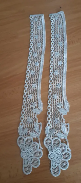 Assortimento di applicazioni in pizzo e passamaneria, perfetto per cucito creativo o personalizzazione abiti o lingerie: 3 colletti blu scuro a "V" in macrame'. Uno ha uno spigolo un po' rovinato. 19x19 cm 11 applicazioni verde acido e 6 color carne motivi floreali singoli. 14x5 cm 2 strisce lunghe azzurro polvere bordure rifinite con un motivo a ventaglio sulla punta. 38x4 cm 5 angoli bianchi pizzo San Gallo/Macrame per fazzoletti, biancheria o piccoli inserti a punta 25,5x25,5 cm 8 bordure celesti ad angolo floreali 12x15 cm 1 mini fiore grigio perla 7,8x5 cm Pezzi mai usati come nuovi.